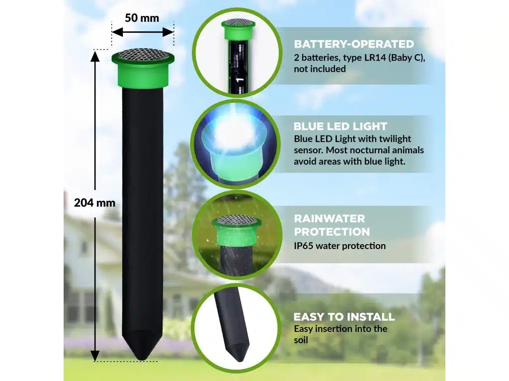 Zariadenie pracuje ticho, bez chémie a bez pascí, čo z neho robí ekologické riešenie ochrany záhrady.