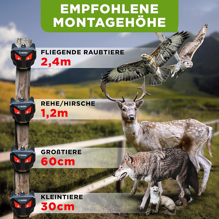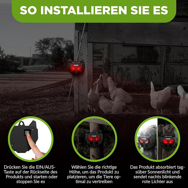 - Jednoduché použitie: Napájanie pomocou solárnej energie, batérie sa dobíjajú slnečnou energiou. Stačí zapnúť a umiestniť na miesto vo výške očí zvierat, aby ste ich odohnali.
